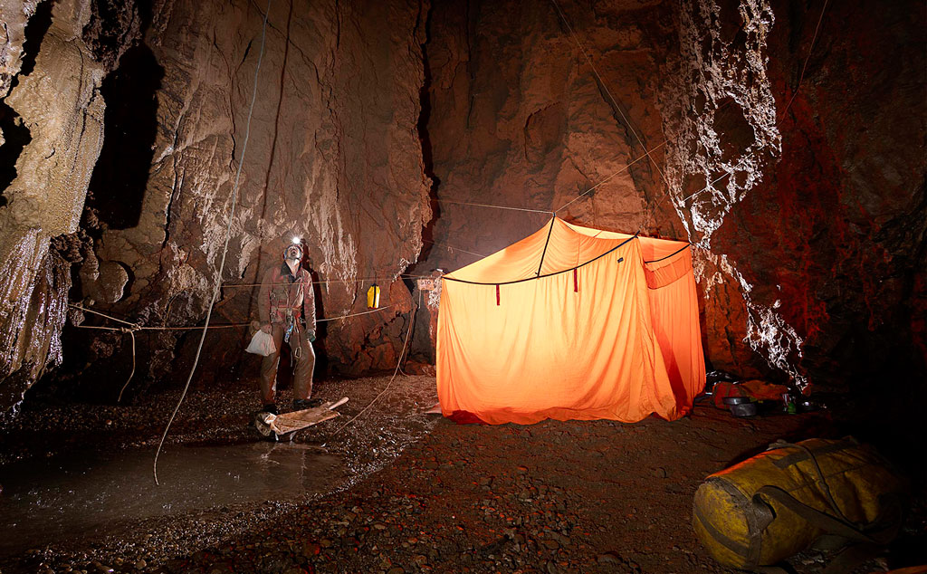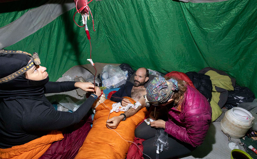 Between Monday and Thursday (4-7 September) the casualty was provided with urgent medical treatment in the underground campsite at a depth of 1,050 m to stabilise and prepare him for extraction. Communications during this time were through a fixed-wire telephone from the entrance to a depth of -500 m assisted by runners carrying messages. Later, a CaveLink wireless system greatly facilitated communications throughout the system.