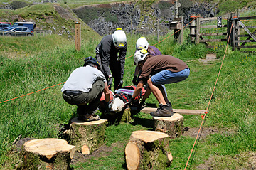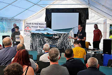 Hosted by South and Mid Wales Cave Rescue Team (SMWCRT) at Penwyllt the event was attended by over 80 cavers representing most of the UK cave rescue teams. Those making a long weekend of the conference were able to enjoy an introductory social on the Friday evening with a meal of Cawl (traditional Welsh lamb stew), huge chunks of bread and cheese, and some excellent apple crumble and custard (not necessarily all in the same bowl!), plus a bar run by South Wales Caving Club, while watching a series of caving and cave rescue slideshows and films (produced by Andy and Antonia Freem) in the marquee set-up for the weekend talks.