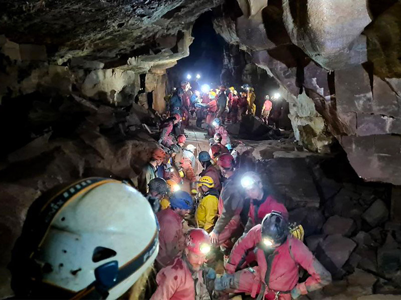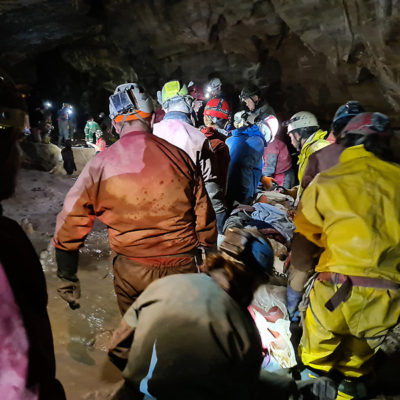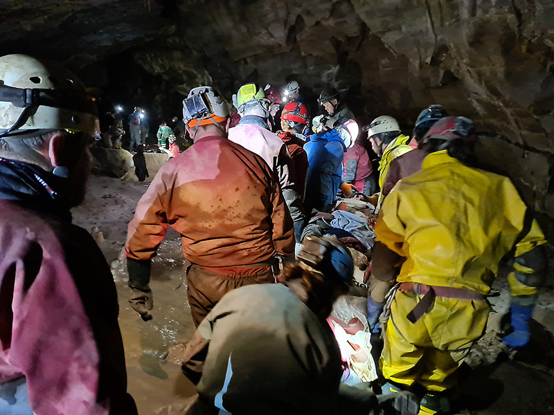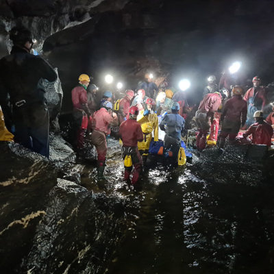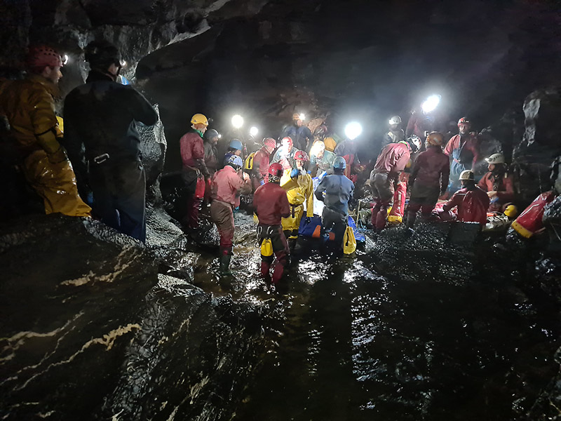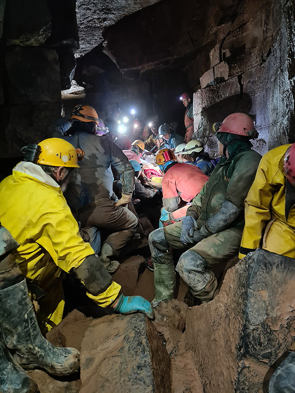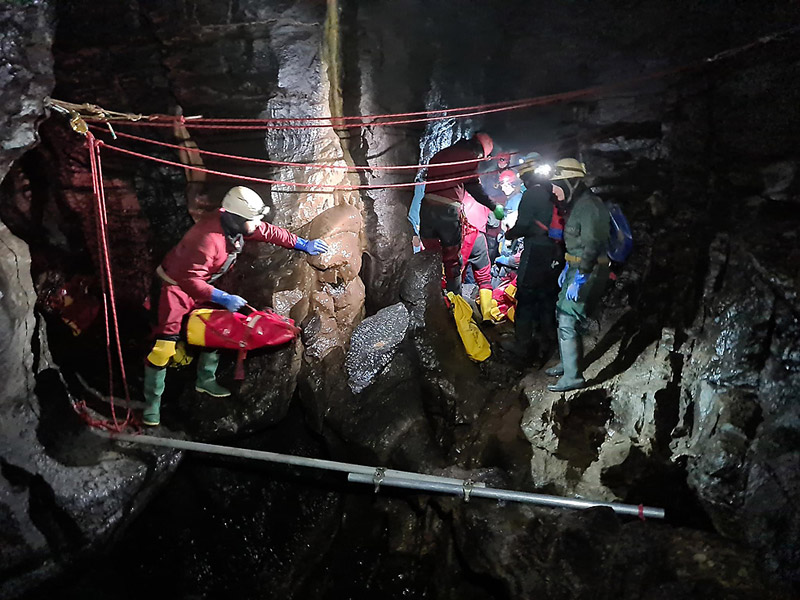There were numerous cameos played out throughout the rescue of small groups resolving the best and safest route or method to negotiate each obstacle immediately ahead. Specialist parties prepared the way ahead, with numerous pitches rigged impressively. The casualty shelter was erected, so that it would appear on the turn of a corner into wider passageway, as an oasis, affording the casualty a degree of privacy and warmth for essential medical examinations and comfort breaks. A scaffolding party set off to the streamway and worked to bridge the deeper plunge pools. The medical team was brilliant throughout, conducting essential medical examinations and interventions under very difficult circumstances of muddy, constricted or water sprayed passages. Huddled individuals, often shrouded in the fabric of rescue shelters to fend off the cold, sat in alcoves or widenings of passageways to operate Cavelink (a through rock communication system) and maintain the two-way flow of essential information to ‘Surface control’ at Penwyllt. Messages were sent to a surface Cavelink team, sat in the open above the cave, enduring the early winter weather, who relayed messages to and from the control by digital radio. A total of 256 cave rescuers were deployed, with a further 19 on site ready to assist at the time the rescue operation concluded.